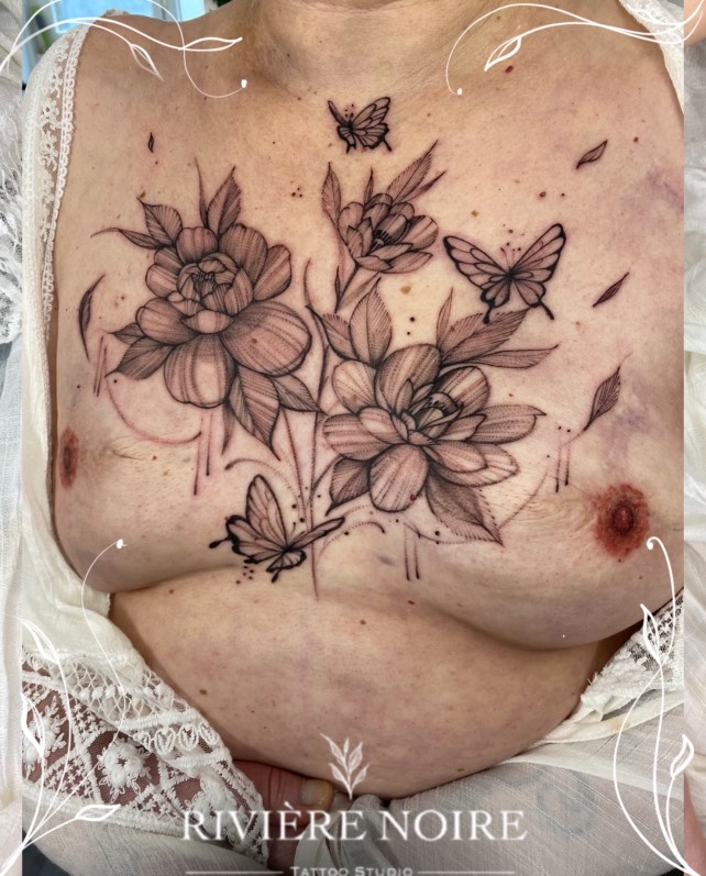 À travers ses aiguilles, Cannelle aide les femmes à se réconcilier avec leur corps, parfois marqué par la maladie. Sur une poitrine qui a connu le scalpel, elle concentre sa douceur et son art pour dessiner une aréole similaire à l’autre sein, ou réaliser deux aréoles à partir du souvenir de la patiente*.